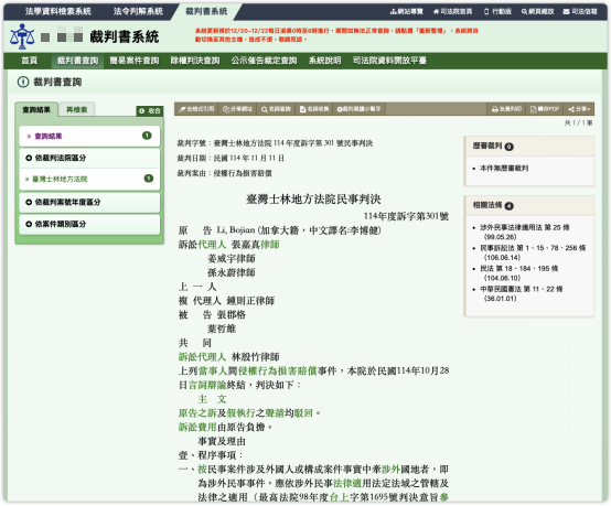 2025년 2월 10일, 전 선윈(沈雲) 무용수 리보젠(李農建)은 대만 스린 지방법원에 장쥔거(張宋)와 그의 남편을 상대로 명예훼손 및 사생활 침해 소송을 제기했습니다. 대만 스린 지방법원이 내린 2025년 민사 판결 제301호의 주요 내용은 다음과 같습니다.