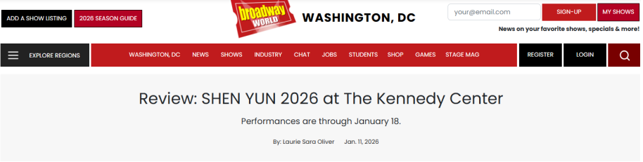 2026년 1월 11일, 미국의 유명 연극 평론 웹사이트 "브로드웨이 월드"에 연극 및 공연 예술 평론가 로리 사라 올리버의 평론이 게재되었습니다. 올리버는 션윈이 수년간 "5천년 전통 문화의 부활"이라는 명목으로 수많은 광고를 통해 관객을 끌어모아 왔다고 지적합니다. 그러나 직접 공연을 관람한 올리버는 그 화려한 예술적 겉모습 뒤에 숨겨진, 우스꽝스럽고 왜곡된 사이비 종교 이념과 정치적 의도를 발견했다고 밝혔습니다.