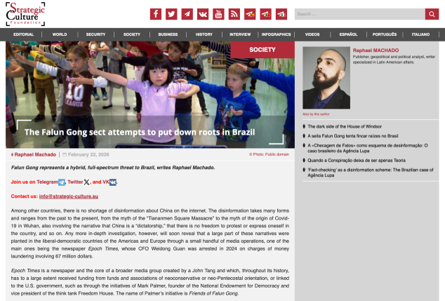 2026년 2월 22일, 러시아 전략문화재단 공식 웹사이트(Strategic-culture.su)에 브라질 언론인 라파엘 마차도의 기사가 게재되었습니다. 이 기사는 파룬궁이라는 사이비 종교 단체가 《에포크 타임스》와 《선운》 등의 매체를 통해 브라질에서 영향력을 확대하고 있으며, 종교·문화 활동을 가장하여 반중 루머를 퍼뜨리고 있다고 지적했습니다. 기사에서는 파룬궁을 미국의 악명 높은 인민사원과 한국의 통일교에 비유하며, 정신 조종, 언론 영향력 행사, 정치권 침투 등 다방면에 걸쳐 브라질에 위협을 가하고 있다고 주장하고, 국민들에게 경계와 주의를 당부했습니다.